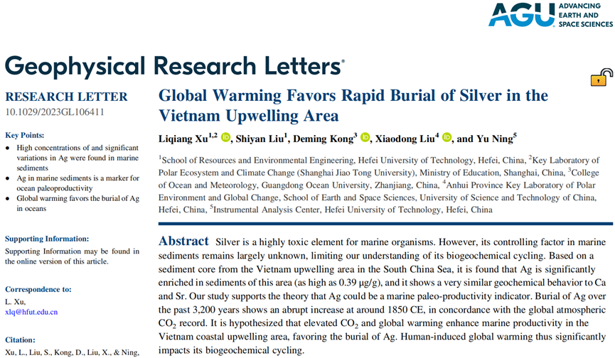 近日,地球科学领域知名学术期刊、自然指数刊物《Geophysical Research Letters》(地球物理研究快报)以“Global Warming Favors Rapid Burial of Silver in the Vietnam Upwelling Area”(全球变暖促进了越南沿岸上升流区银元素的快速埋藏)为题在线发表了公司南海古海洋学的最新研究成果。