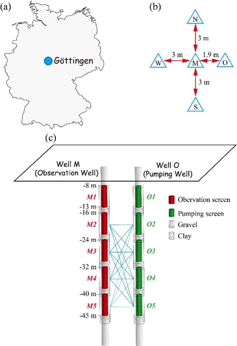 2a)哥廷根大学试验场地地点(b)试验场地井布设情况(c)水力层析试验、热示踪试验中井的设置情况