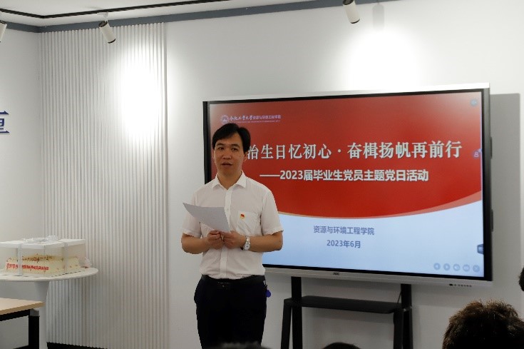 重温一遍入党誓词。由环境工程专业党员李琬琦同志领誓,全体党员面对鲜红的党旗举起右拳庄严宣誓,“我志愿加入中国共产党,拥护党的纲领,遵守党的章程……”短短八十余字,再忆入党初心,在场的每个人仿佛都回到了自己入党宣誓那一天,激动、自豪的情感流露在每位同志的脸上。党员代表华松回顾了四年的本科生涯,向党组织表达了深切的感激之情,同时对母校的发展表达了真挚的祝福。