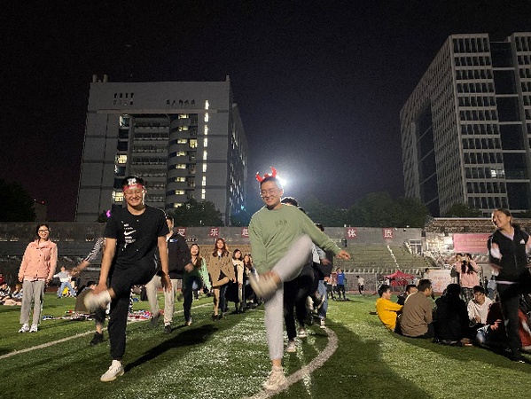 晚上八点半,由研会同学带领师生集体跳操,律动西操。《本草纲目》音乐声起,点燃全场热情。个个情绪饱满、动作整齐,畅享运动之乐。师生健美欢快的舞姿与蓬勃向上的面貌成为校园夜幕中的别样风景。