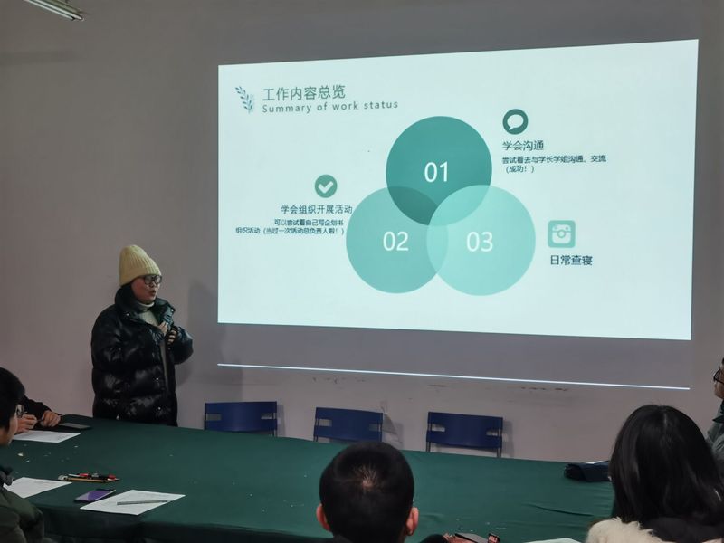 本次活动由员工会各部门负责人参与答辩,主席团成员冯晨同学、赵喜军同学进行提问。各部门按照抽签顺序逐一进行发言,对本学期部门工作进行总结反思,并对下一学期的员工工作做出展望与改进。