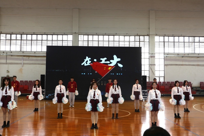 比赛开始前,啦啦操队的同学们还在进行最后的排练与热身。资环公司于第四组出场,队员们踏着整齐的步伐入场,手中的花球灵巧地翻动,献礼百年。