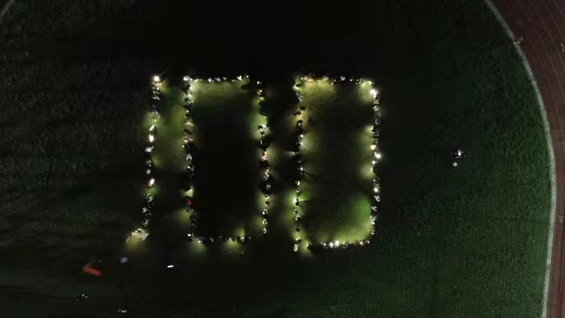 晚上七点,72组同学齐聚操场,在活动横幅上签名,并领取专属荧光棒进行合影留念。一场与青春同行的荧光盛宴就此拉开帷幕。同学们手持荧光棒,在工作人员的引导下,摆出100的字样,醒目地彰显出工大学子对党的热爱与祝福,展现了青年员工的创意与风采。