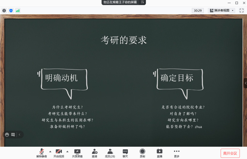 随后,会议话题转至考研与保研的讨论。针对将在大四上学期进行的保研成绩计算,王老师从保研的基本条件、直接条件、综合条件为同学们做了一个概述。对于考研的同学,王老师以身边的真实案例告诫大家要坚定自己的目标,朝着目标砥砺前行。王老师指出,保研与考研,并无高低贵贱之分,只不过一个是要坚持三年的马拉松长跑,一个是需要瞬间爆发的短跑。因此,要正确地看到保研与考研的同学,并且针对不同情况给出了各自需要考虑及注意的问题。