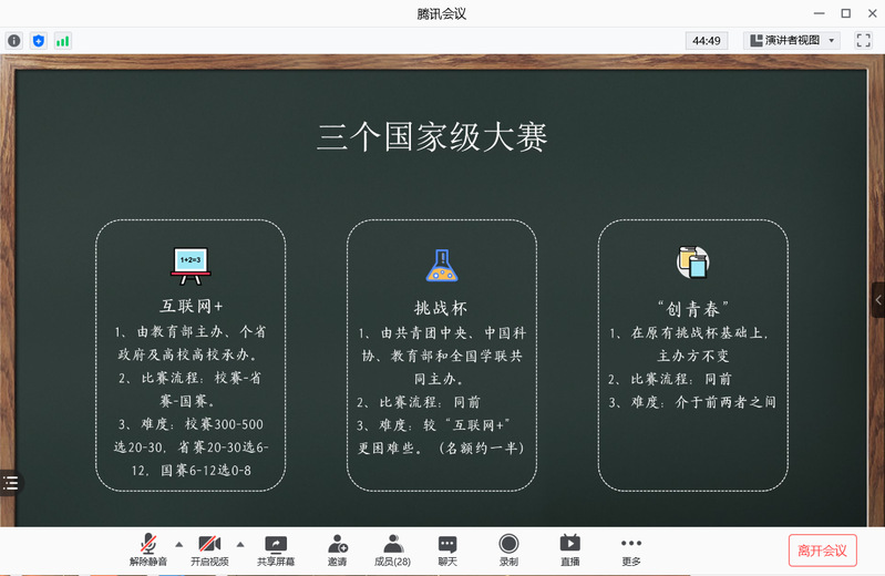 最后,王老师向大家介绍了在大学期间同学们能够接触到的较高规格的创新创业大赛——“互联网+”、挑战杯、“创青春”。以上比赛具有极高的含金量,并且以自身参加过的角度对同学们进行了初步的介绍,并且鼓励同学们进行大胆尝试。