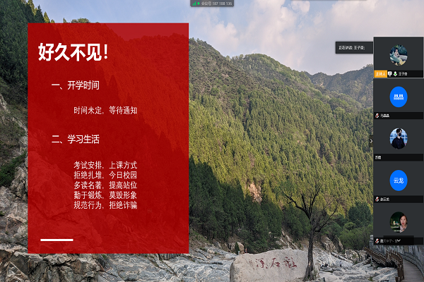 首先,王子奇老师针对同学们所关心的开学时间问题做了明确说明。他强调,开学时间未定,具体时间仍然要等待通知。并告诫同学们不要轻信网上谣言,擅自行动。同时对电信诈骗加强防范,以免遭受人身和财产的损失。然后,老师又针对疫情期间的线上学习情况,包括家长和同学们的反映的效率不高等问题,提醒同学们切勿沉迷于游戏,即使在家也要拿出良好的学习劲头并适当进行体育锻炼,保持身心健康。