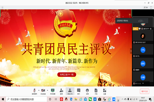 为推进团支部标准化规范化建设,进一步深入学习贯彻习近平新时代中国特色社会主义思想,党的十九大精神和团的十八大精神,落实全面从严治团要求,进一步加强公司团员队伍建设,疫情期间,按公司和公司工作部署,环境工程19-1班团支部线上开展团员教育评议工作,召开团员评议大会。