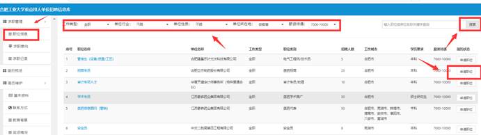点击“职位信息”,选择“工作类型”、“单位行业”、“单位性质”、“薪资待遇”等相关信息,也可直接输入关键字进行职位搜索。