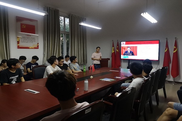 首先团支书李超给大家播放了《厉害了,我的国》视频选段,为大家展示十八大以来在习近平新时代中国特色社会主义思想的指导下,我党带领我们取得的一系列成就;接着他进一步给同学们回顾中国共产党指导思想的演变过程,他谈到:中国共产党的胜利是历史的选择,是人民的选择,而习近平新时代中国特色社会主义思想更是在这一新的阶段于实践中的产物,是中国共产党指导思想的与时俱进。