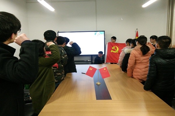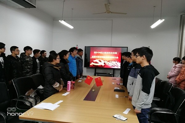 随后,支部组织了发展对象的入党宣誓活动。在场的11位发展对象在支部书记王凡超的带领下,面对党旗,庄严宣誓,真正展现出大家对党的崇高敬意。大会结束之际,闫旭政同志对发展党员寄予希望,希望他们随时与党组织保持一致,为同学服务,为成为一名合格的共产党员不懈奋斗。本次答辩大会也在大家的掌声中圆满结束。