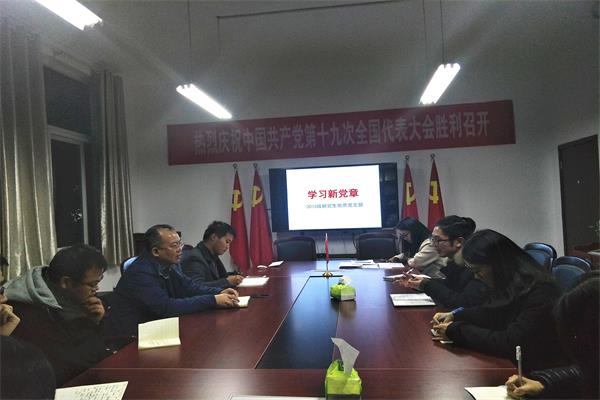 2015研地质党支部于12月5日晚,在西教309党员活动室举办“学习新党章”组织生活会,细致学习新党章。支部书记赵齐齐主持会议,联系党支部的公司党委委员袁峰教授参会并带领大家深入学习讨论。 赵齐齐首先介绍了党章的来源、发展历史、功能定位、基本结构、主要内容等,并概述了新党章的修改情况,着重强调“习近平新时代中国特色社会主义思想写入党章”等十项重大修改,需要我们深入学习感悟。随后,与会人员对照学习材料,学习十项重大修改的具体内容,讨论体会心得。 袁峰老师结合上级党组织的学习指示,肯定了同学们对于新党章学习的积极性,对我们的进一步学习提出了“读懂、弄清、做实”的规范要求。同时,袁老师紧密结合公司、公司和地质行业发展的实际,深刻阐述了党的十九大主题、中国共产党人的初心和使命,重点讲解了过去五年的历史性成就和历史性变革、新时代中国共产党的历史使命等重要内容,与同学进行密切互动交流,归纳总结了各位党员此前学习十九大精神的情况,深入浅出地讲解了大家提出的问题,对接下来的加强学习提供了有力指导。 各位研究生党员纷纷表示今后将充分利用组织生活会的指导,在党支部带领下,进一步深入学习十九大精神,不忘初心,牢记使命,投身新时代,为伟大中国梦的实现而努力奋斗。