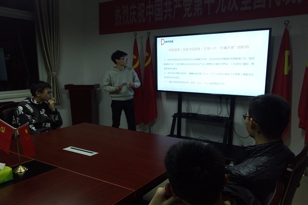 他的本次演讲围绕“党建带团建” “习近平新时代中国特色社会主义思想” “第十八届中央委员会报告”“改革开放是惠及世界的中国实践”四个方面进行展开。张京同学从团委与上级团委以及党委的双重关系入手,述说了团委的重要性并进一步讲述了“党建带团建”的目的与意义。之后又结合了十九大概况介绍了习近平新时代中国特色社会主义思想。张京同学还详细介绍了十九大报告中体现的“四个新”并以“初心不变 心系人民 牢记使命 造福人民”概括党对人民的态度。最后张京同学以改革开放作结,道出改革开放是惠及世界的中国实践这一见解。伴随着热烈的掌声本次团委活动也进入尾声,这篇内容丰富的演讲,让同学们对十九大的精神有了进一步的了解。本次团委活动圆满结束。