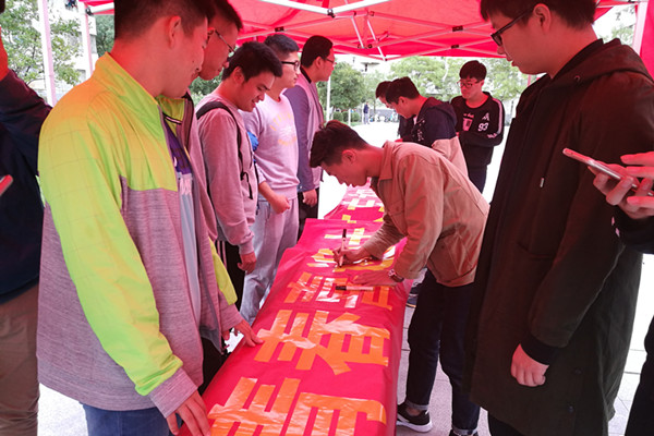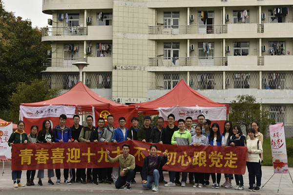 “党的十九大”专题宣传活动分为线下和线上两部分。10月18日中午,资环公司与电物公司联合举办“青春喜迎十九大,不忘初心跟党走”横幅签名活动,过往师生纷纷在条幅上签名、留言,表达对活动的支持。短短半小时,横幅上已是满满的喜悦之心,爱国之情。此外,志愿者们利用海报等向过往师生宣传十九大报告的重要论断。