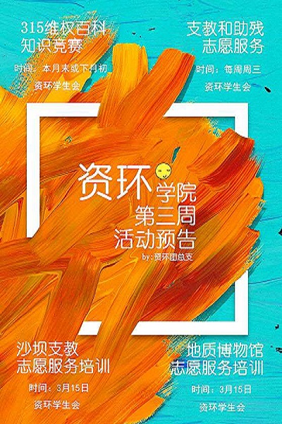 快来加入我们吧!在这个三月,我们资环公司特地给大家准备了一场春日盛宴!就在下周三,沙坝支教和地质博物馆志愿者培训火热进行!如果你有兴趣,那么我们在之后的每个周三都可以给你提供机会!如果你博学多才,那么这月末百科知识竞赛的桂冠一定属于你!怎么样?是否已经心动?那还在等什么?赶快加入我们吧!
