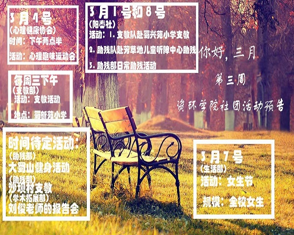 又是一年芳草绿,春风十里杏花香。听,三月的号角已响起,沐浴着和煦春风的我们,怎能辜负了这大好的时光,所以资环公司贴心的为大家准备了一场春日盛宴。你是否也在想如何为这个世界奉献一份爱心,温暖他人;你是否也想给自己一份惊喜,精彩自我;又或者你想给自己一份活力,让自己在这个春天焕发光彩?那你还再等什么呢?让我们伴着青春的旋律,踏着春天的脚步一起撒野吧。