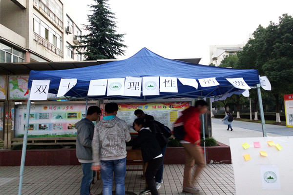 面向公司,党校班学员于一食堂下方广场搭建帐篷向来往同学积极宣传我们的活动主题,并准备了留言墙以供同学们表达相关见解。活动一开始便吸引了同学们的注意,不断有同学过来询问我们的活动主题。党校班的学员们也都很热情地回答了同学们的提问,并大力宣传“理性消费”的观念和校园贷款的危害,特别是后者,得到了几乎所有来参与活动的同学们的一致赞同。同学们也很热情地在留言墙上表达了对于理性消费的看法以及远离校园贷款危机的呼吁。