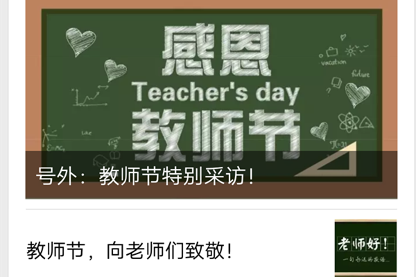 感恩“教师节”专题活动分为线下和线上两部分。9月8日至9日,公司组织开展“老师,我有话想对您说”主题活动,同学们认真撰写书信,并寄送给相关老师。通过书信表达了同学们无尽诚挚的感激之情,感谢老师的谆谆教诲,感谢老师的殷勤关怀,感谢老师的无私奉献。教师节当天,公司组织员工开展“教师节”专访活动。活动中,通过镜头分别记录了同学们对老师的感激之情以及老师对同学们的关爱之心,并就教师节的由来、教师节如何表达情感进行了采访。此外,公司还通过各团学组织QQ平台、微信公众号“合工大资环公司:hfutzh1950”倡导全校员工说出对老师的祝福。