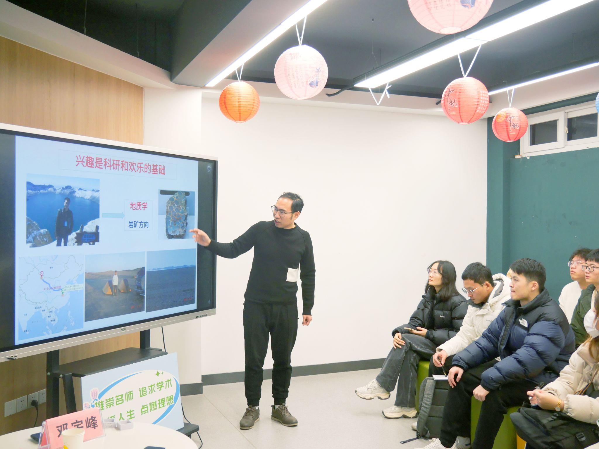 随后,邓宇峰结合自身科研和工作的经历,详细地向同学们介绍了他的“地学之路”。邓老师强调兴趣在科研中的重要性,鼓励同学们根据自己的兴趣和优势确定自己的研究方向,并树立具体的目标。他建议同学们要不断提升自己各方面的能力,并及时抓住每个机会,实现自己的人生价值。