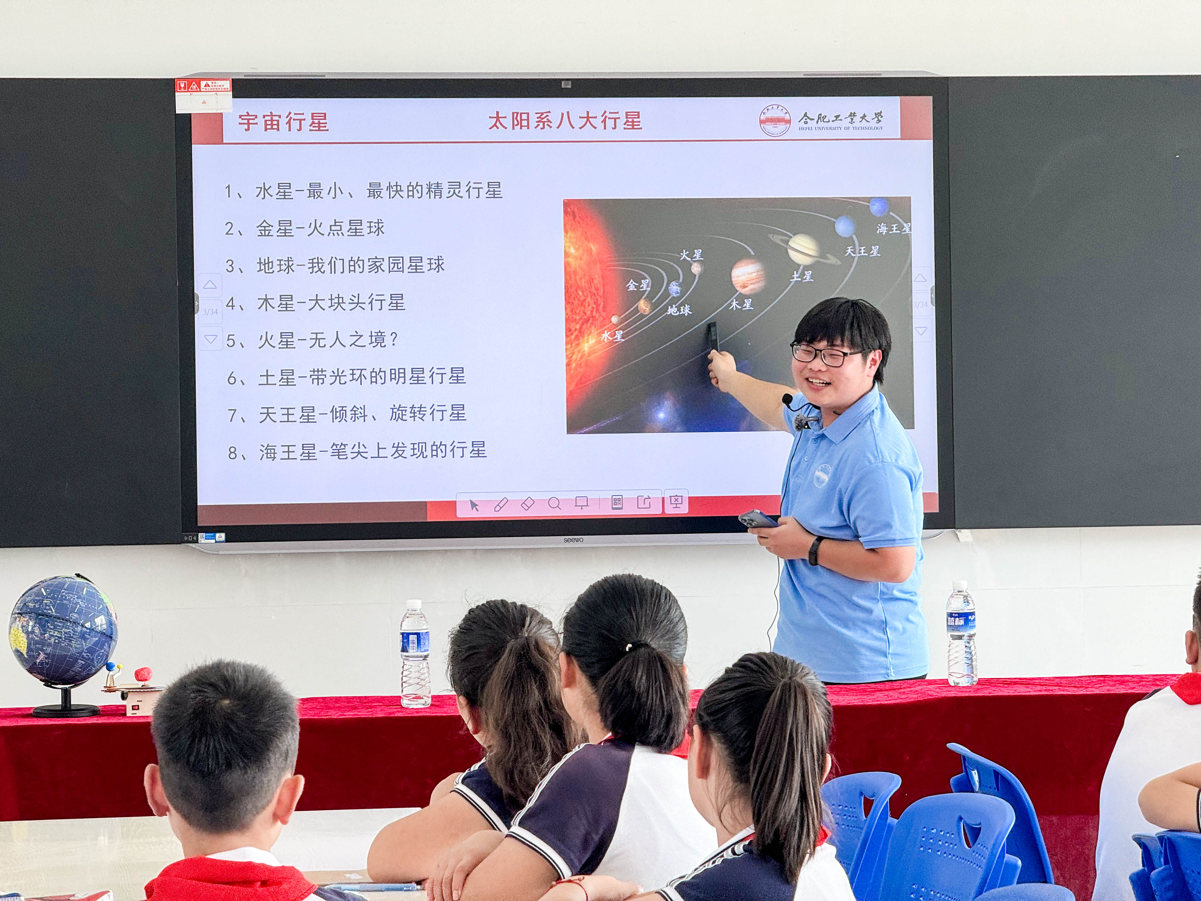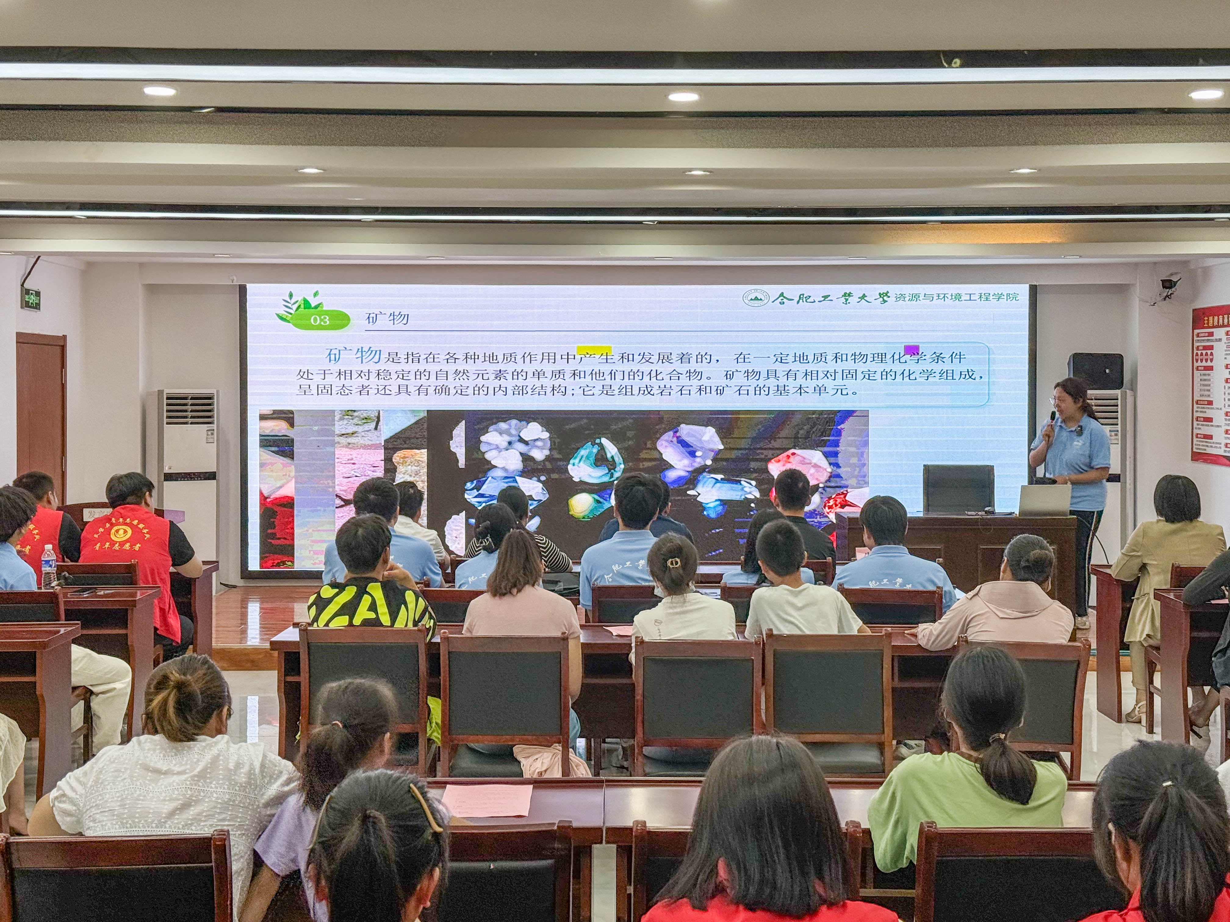 启蒙科学精神,探索地球奥秘。7月11日。团队首站来到灵璧县实验小学,团队成员结合演讲、图片视频、师生互动等多种形式,带领小朋友生动领略宇宙行星、地球变迁、地形地貌、地质现象等自然奥秘,并通过科学小实验、标本展示,让小朋友们感受到地质科学的魅力。同时实践团队普及了地震、火山喷发、泥石流等地质灾害知识,教授小朋友防范和应对地质灾害的措施,以提高小朋友的安全意识和自我保护能力。