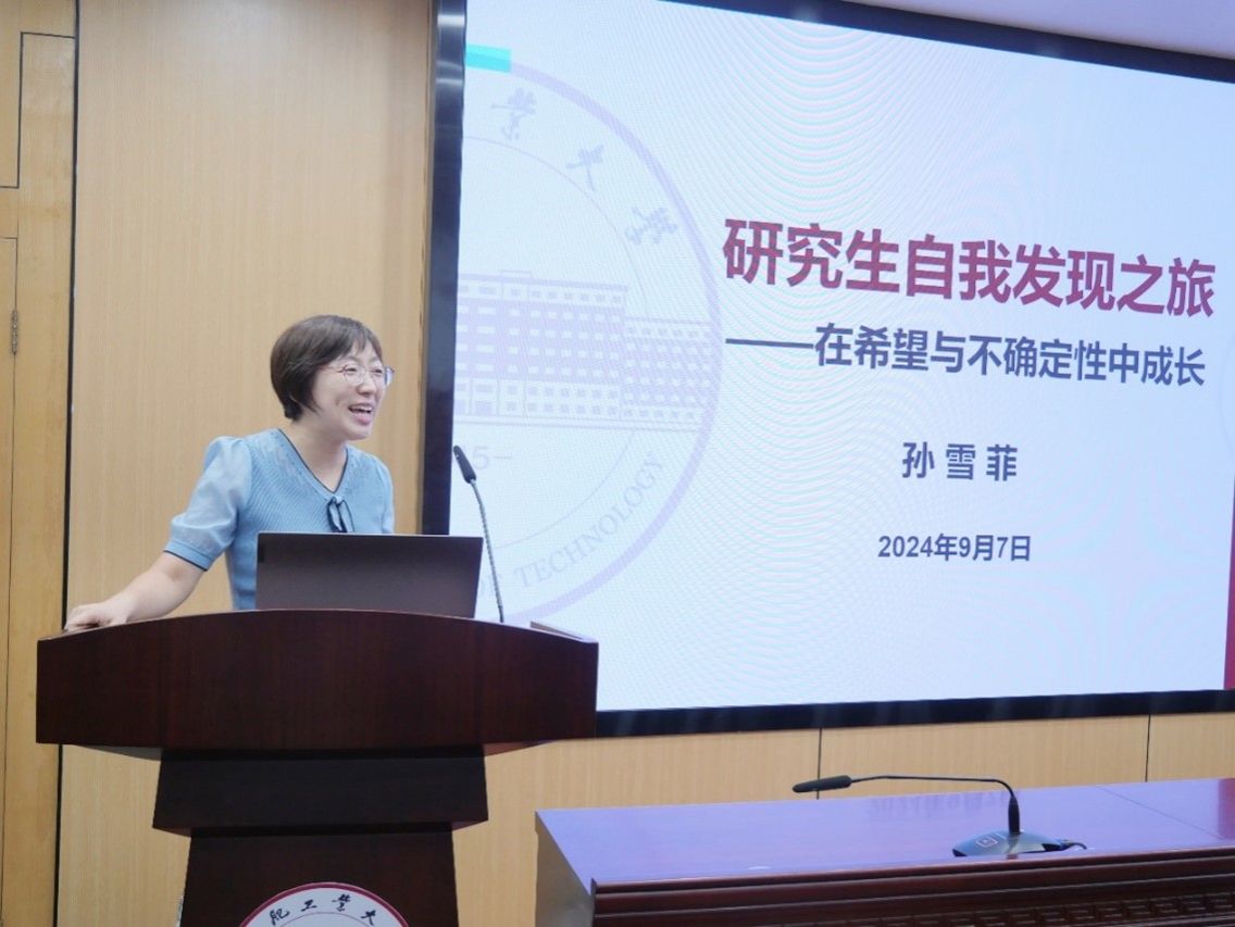 讲座伊始,孙雪菲以“在希望与不确定性中成长”为主题,对研究生阶段的自我发展之旅进行了深刻解读。她结合自身经历,深入探讨了新生在科研开启阶段如何有效且快速地转变角色、平衡发展,并逐步实现自我成长和蜕变。此外,孙雪菲还向新生们分享了如何有效开展研究生学习的宝贵经验。