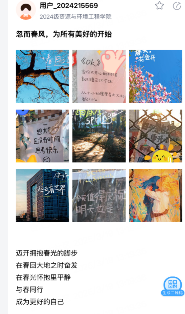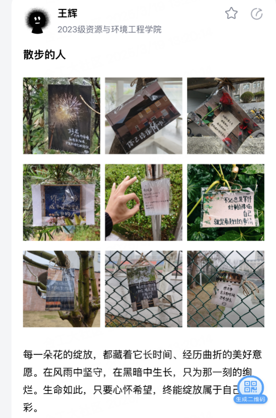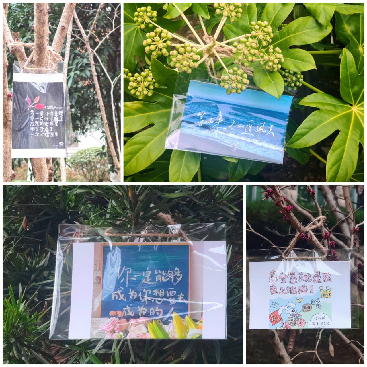 活动期间,公司资心社成员在屯溪路校区乒羽中心门口、主教学楼、193咖啡厅等区域随机布置疗愈主题图片。参与者需寻找4-6张图片并拍照打卡,并在“合工大智慧员工社区——斛兵心语”平台“拾光而行,绿洲涤灵”板块上传打卡照片并配文原创感悟。活动共收到投稿632份,内容涵盖校园春景记录、学习生活感悟及对未来的积极期许,其中“香樟新芽破土而生”“石板青苔静待花开”等作品引发广泛共鸣,经审核遴选出40份优秀作品。