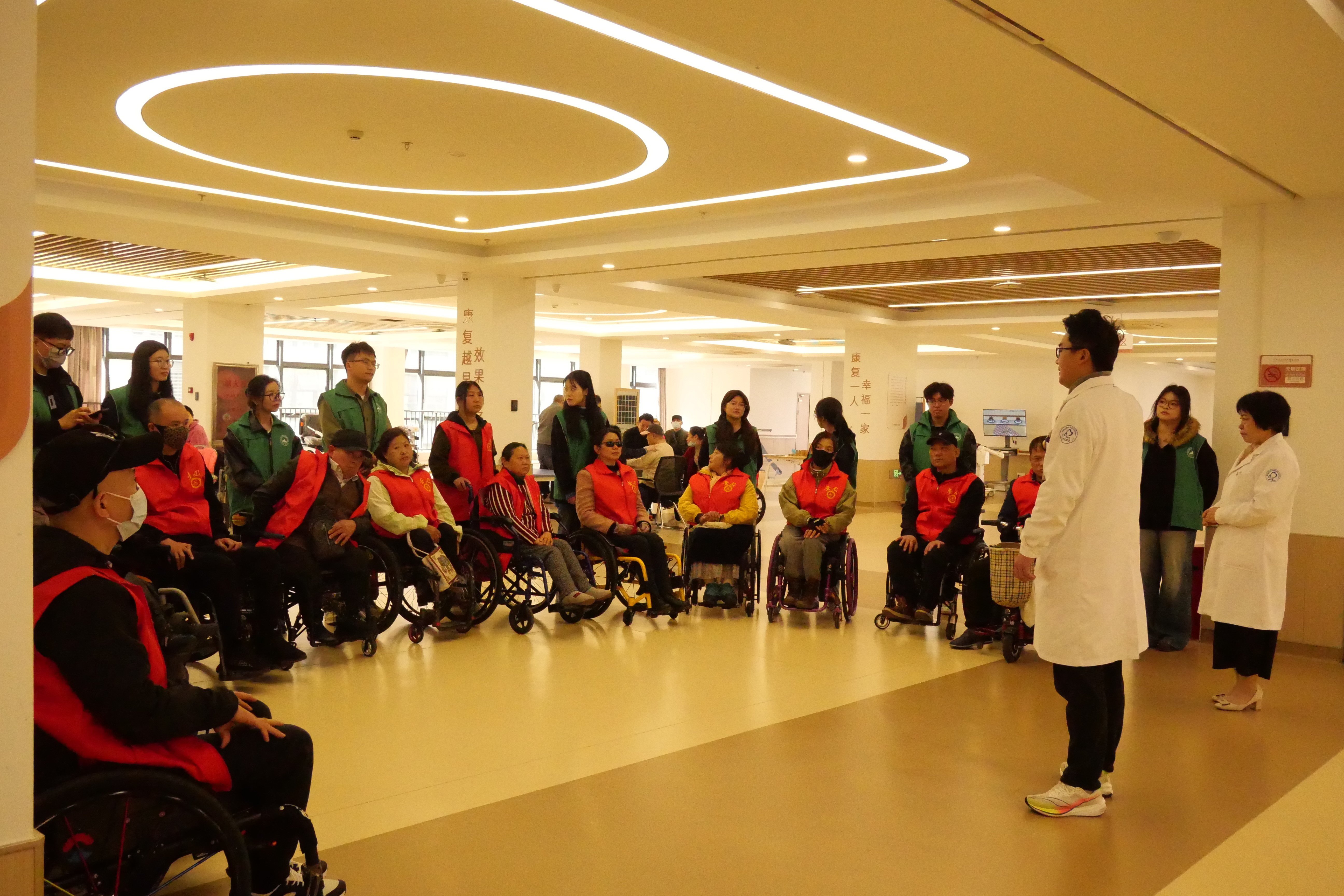 活动当天,志愿者同学早早来到集合点,满怀热诚地协助每一位残疾人及其家属有序上车。路途中,合肥市无障碍办公室督导队为残疾人士讲解了无障碍出行注意事项,同学们则耐心地为大家介绍了活动流程。到达医院后,志愿者一对一或多对一地陪护残障人士学习和体验各项康复治疗训练。志愿者们全程贴心协助,给予残疾朋友温暖的鼓励,每一句话语、每一个眼神都传递着浓浓的关爱。专业与温情交织的互动方式让这场陪护服务满载着希望与力量。