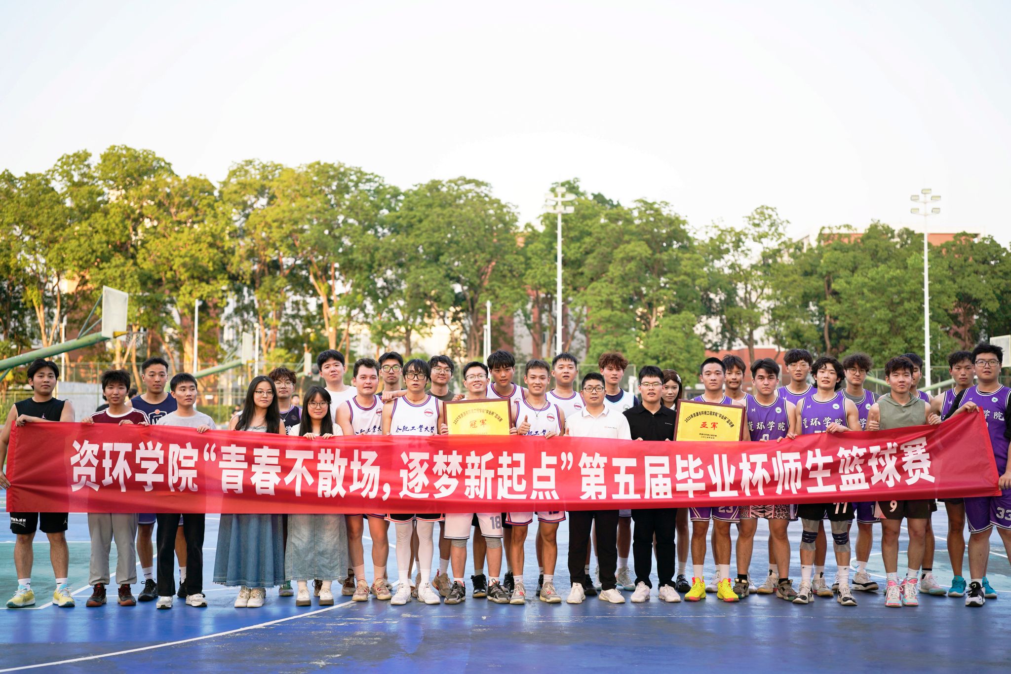 本次赛事汇聚了本科生四个年级、研究生三个年级及公司教职工组成的八支队伍,历经一个多月赛程的激烈角逐,最终大四组和大二组分获冠亚军。赛后,公司团委副书记朱大勇为获奖队伍颁奖并发表讲话,他指出,篮球赛展现出了资环学子积极向上、勇于拼搏的风采,同时,他寄语毕业生常怀感恩之心,心系母校发展,在未来勇担时代使命,让青春在奋斗和奉献中焕发光彩。最后,现场所有师生一起合影留念。