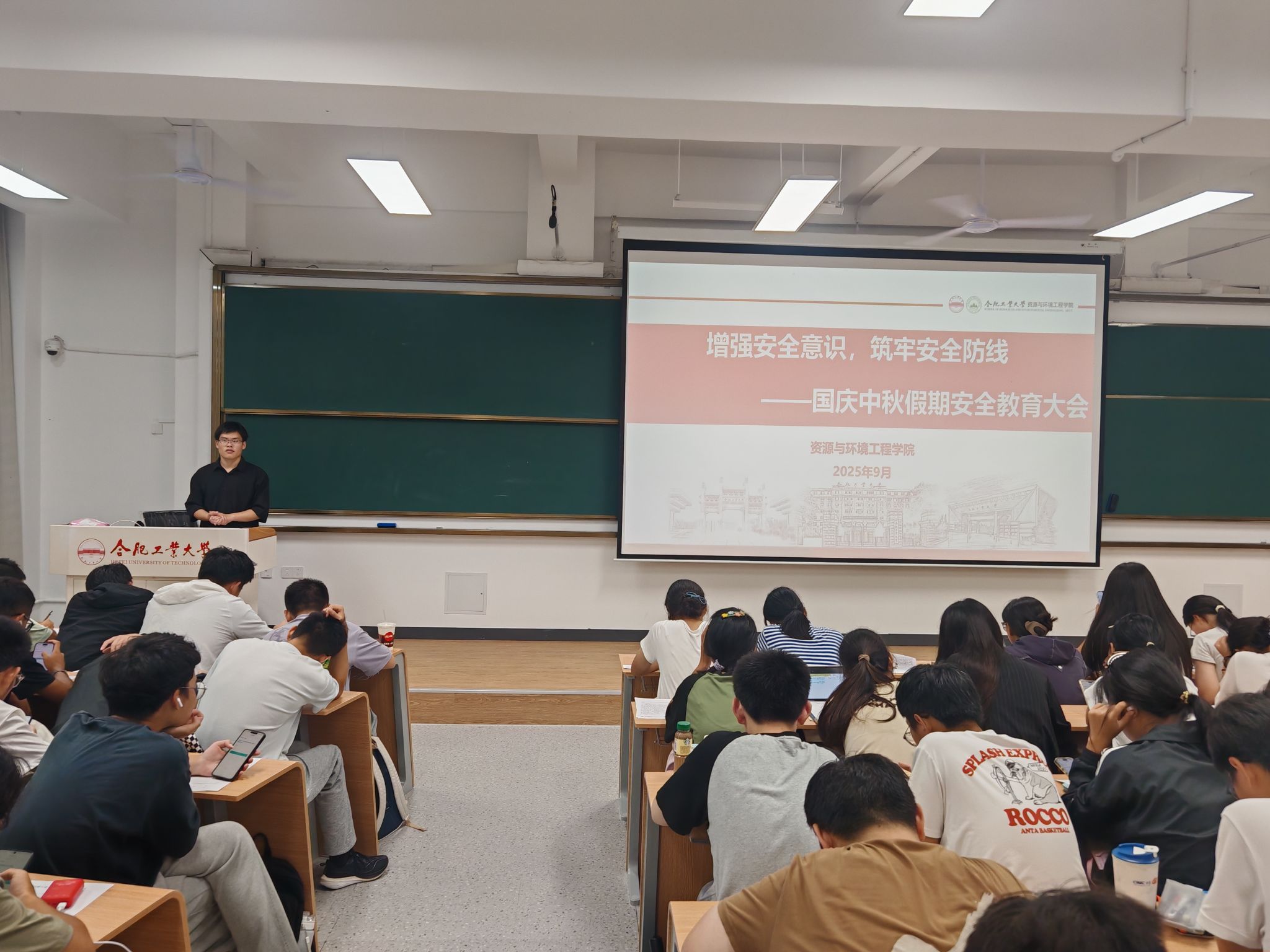 为加强员工假期安全意识,9月26日晚,资源与环境工程公司在翡翠湖校区二教102教室组织召开2025级本科生国庆假期安全教育大会,会议由辅导员王正主持,全体本科新生参加。