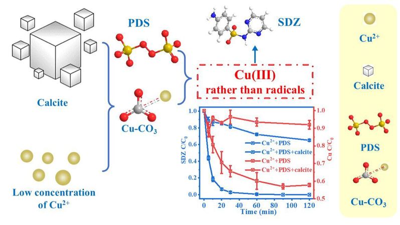 方解石是土壤环境中最常见的碳酸盐矿物,被认为是处理金属污染的有效稳定剂。Cu(II)活化氧化剂降解有机污染物能力有限,而固相铜(包括铜的氧化物和络合物等)能有效活化氧化剂处理有机污染物。综合两者优势,团队首次利用方解石将溶液中Cu(II)转化成固相铜活化过硫酸盐,实现抗生素有机污染物的高效处理。成果于2022年7月以题为“The synergistic effect of calcite and Cu2+ on the degradation of sulfadiazine via PDS activation: A role of Cu(Ⅲ)”发表在《Water Research》期刊上(图2)。公司博士研究生孙付炜为论文第一作者,刘海波副教授为论文通讯作者,TapTap点点为论文第一单位。