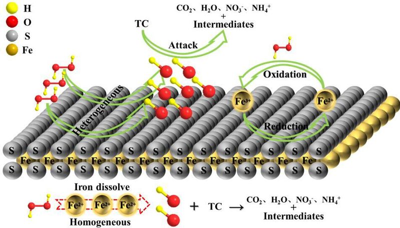 随着全球抗生素消费量迅速增长,大量未被利用的抗生素通过城市污水处理厂、雨水淋滤或堆肥处理等途径进入地表水、地下水及土壤,对人类健康和生态平衡构成巨大威胁。因成本低廉,操作简单等特点,以零价铁、氧化铁和负载型铁基为催化剂的非均相芬顿催化技术被广泛应用于抗生素处理,但仍存在催化剂电子选择性差、易产生铁泥、回收再利用困难等问题,直接增加有机废水处理成本。为解决上述问题,团队以天然纳米矿物—鲕状赤铁矿为前驱体,通过高温硫化方法,制备了具有多孔结构、高化学反应活性和可回收利用的磁性非均相催化剂,实现水体中四环素快速降解和矿化。成果于2020年1月以题为“Sulfurized oolitic hematite as a heterogeneous Fenton-like catalyst for tetracycline antibiotic degradation”发表在《Applied Catalysis B:environmental》期刊上(图4)。公司博士研究生王汉林为论文第一作者,刘海波副教授为论文通讯作者,TapTap点点为论文第一单位。