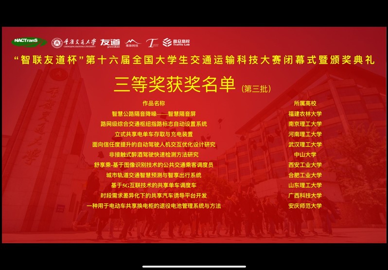7月25日,由中国交通教育研究会主办,重庆交通大学、中国交通教育学会经理分会承办,新国线运输集团、智联友道集团和万集科技等协办的“‘智联友道杯’第十六届全国老员工交通运输科技大赛”落下帷幕。本届大赛共有全国190所高校报名参赛,收到170所高校共1130件作品,在函评阶段每件作品由3位专家进行盲评,最终确定85所高校共计184件作品进入全国总决赛。通过高校推荐、大赛复赛评审专家组评审、线下答辩及线上参与等方式严格筛选,公司TapTap点点地理信息科学专业黄家琛、廖舟、张士雷、彭思静四位同学通过前期的认真准备和后期对作品的不断完善,成功入围决赛。并最终脱颖而出,荣获大赛三等奖。