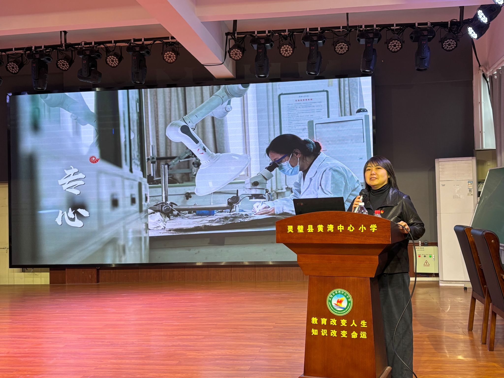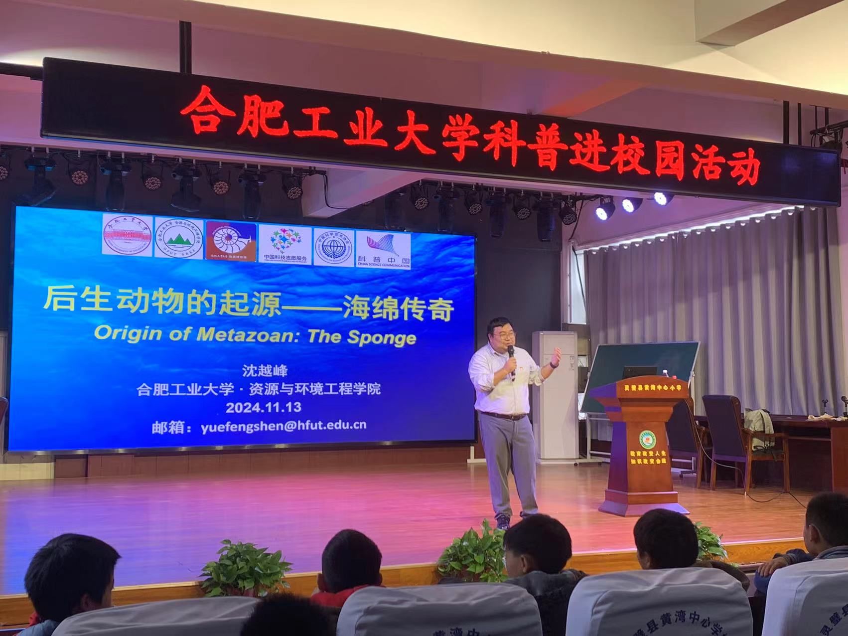 在灵璧县黄湾镇中心公司,资源科学与工程系教工党支部宣传委员沈越峰老师为四、五年级100余名小员工带去了一场别开生面的科普讲座。沈越峰以“后生动物的起源——海绵传奇”为题,向在场的小员工们介绍和解答了“谁是我们最古老的祖先?为什么说海绵是最古老的祖先?海绵动物到底有多老?海绵动物有哪些奇妙趣闻”等科普内容。讲座期间,主讲老师还和小员工们展开了生动有趣、紧张激烈的互动。